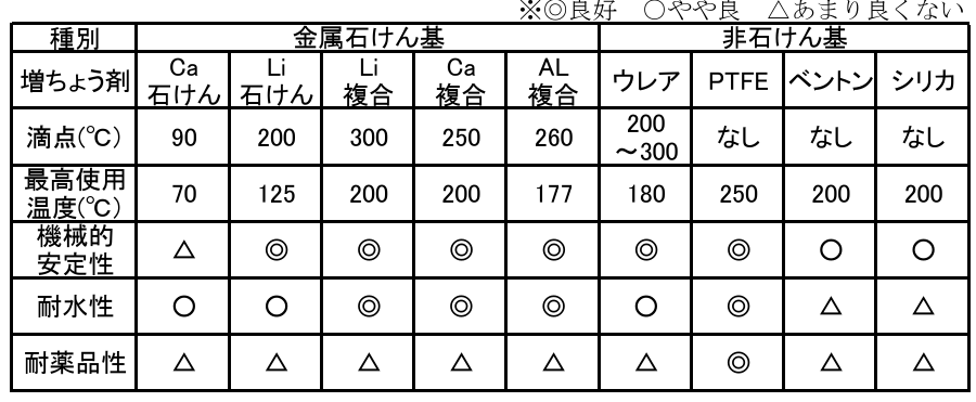 基油動粘度(mm2/s40℃)は、数値が大きいほど粘りがある。動粘度は温度によって変化するため、国際的基準になっている温度(40℃)において測定する。 数値の小さいグリースは高速回転用に使用し、数値の大きいグリースが低速回転用に使用します。