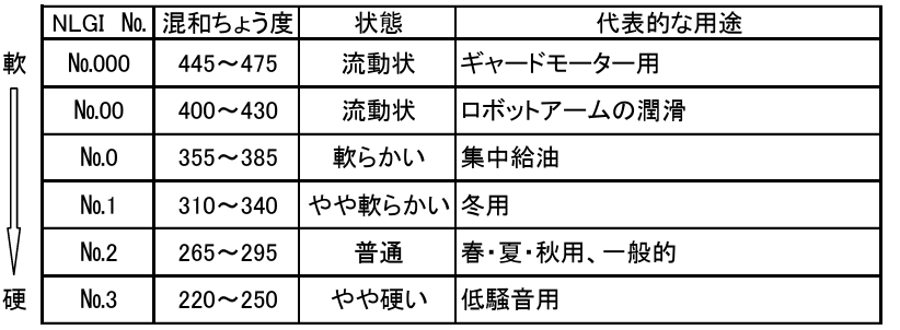 混和ちょう度とは、グリースの硬さを表す数値です。この数値は規定の測定器で算出されたもので値が大きい方が軟らかいグリースです。 NLGIとは、National Lubricating Grease Institute(米国潤滑グリース協会)の定めた NLGIちょう度番号による区分で、数値が大きくなるにつれ、硬いグリースとなります。